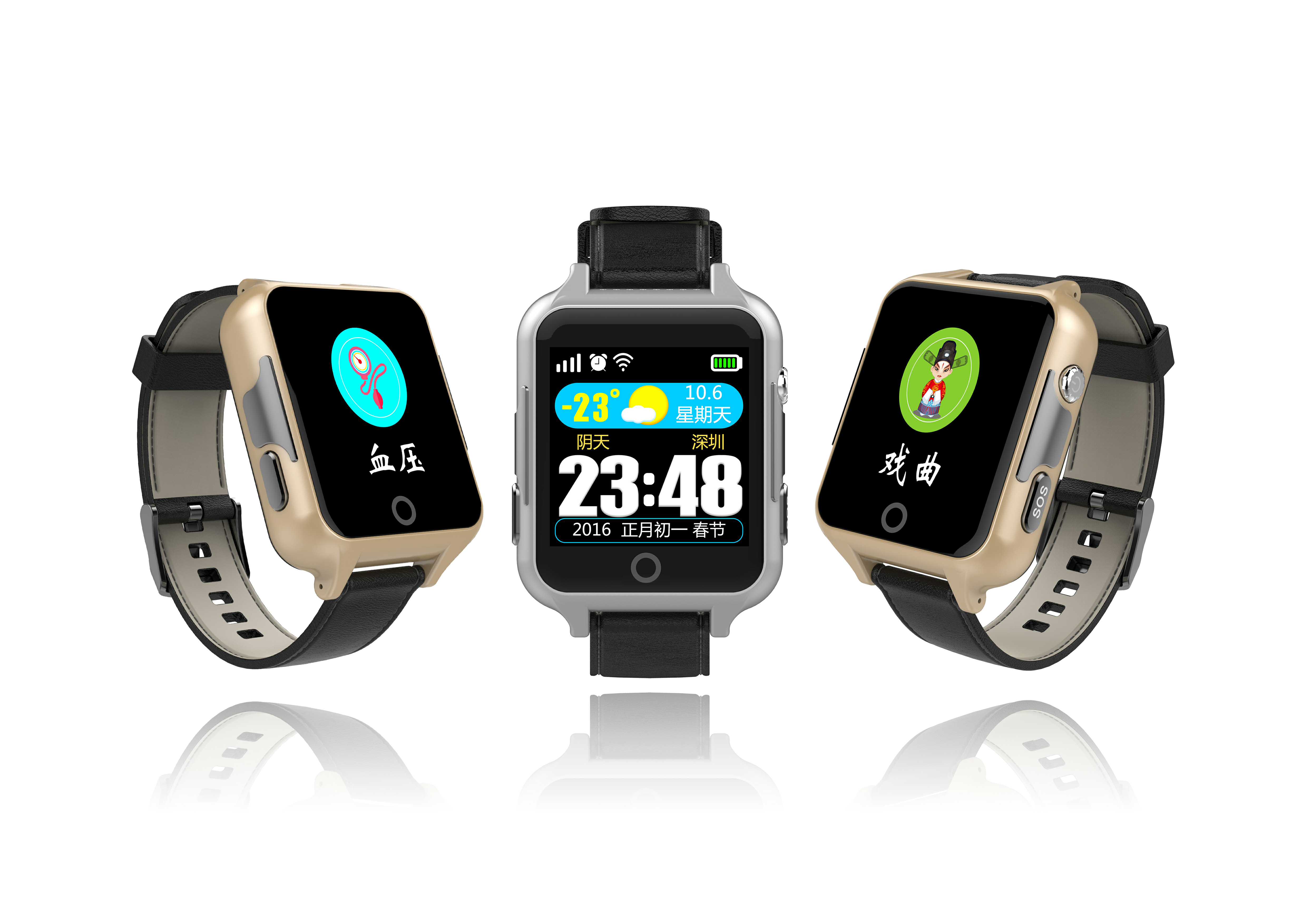 老人电话手表的详细功能:电话本、对讲、健康、足迹、手表闹钟、安全区域、SOS紧急报警、心率、低电量报警、远程关机、戏曲、运动提醒、久坐提醒、吃药提醒、血压测量"