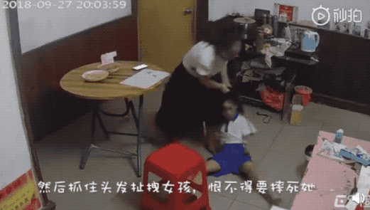她还像发疯了一样,一把抓起女孩的头发,把她整个人往地上拽。女孩头部还被重重摔在地板上。