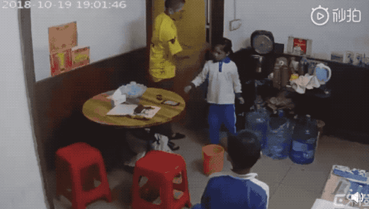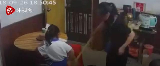 可能因为玩了手机,女孩只能默默承受,被重重的推倒在地后自己默默爬起,不哭不闹地重新坐回桌边。