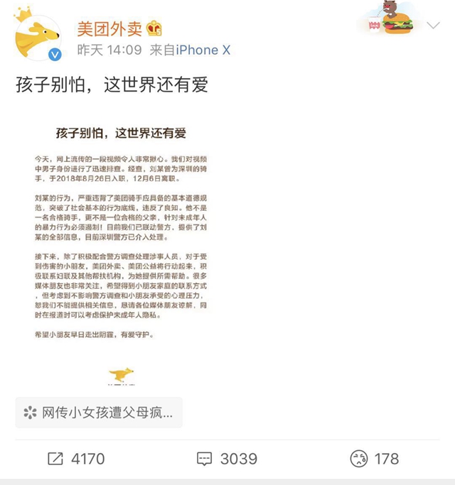 到了中午,美团方面也做了回应:“网爆视频令人非常揪心。我们对视频中男子身份进行了迅速排查。经查,刘某曾为深圳骑手,于2018年8月26日入职,12月6日离职。”