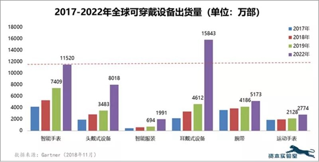 据Gartner最新数据显示,2019年,全球智能手表出货量将达到7400万块,2022年,出货量将达到1.15亿块;而耳戴式设备2022年的出货量将达到1.58亿部,占据35%的市场份额,将超越智能手表(25.4%)。